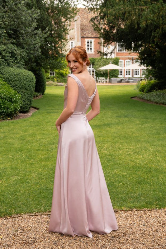 Introducing Wovn, bridesmaid dresses available at Felicity Rose Bridal in Maidstone, Kent, crafted from soft and silky liquid satin fabric for a luxurious touch. Perfect for bridesmaids, prom or special occasions alike, these dresses feature a range of necklines, design details, and hem lengths.