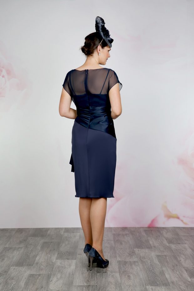 Gorgeous pleated waist, satin, chiffon and jersey dress, with spaghetti under straps and chiffon cap sleeves. The pleated and draped satin waistband nips in your waist to flatter your figure. The jersey skirt falls 25″ from waist to hem. Secured with a zip fastening. Available in any jersey colour. Shown in Navy and Mauve.