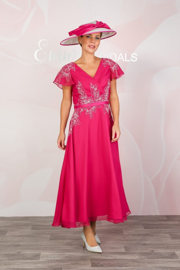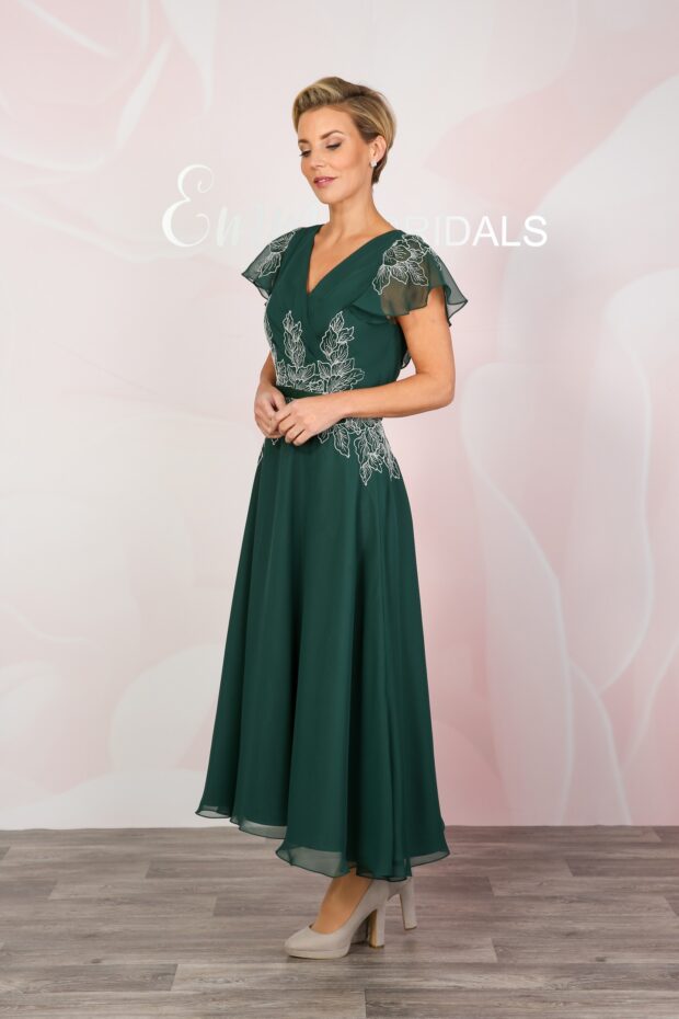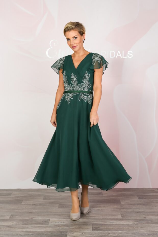 A soft, summery style with a wrap-over effect bodice, floaty capelet sleeves and gorgeous pleating which serves to draw you in at the waist. Light chiffon forms the capelet sleeves which offer coverage on the arms while keeping you cool. Beautiful ivory-coloured lace embellishes the waistline and shoulders while a sleek satin waistband ties the look together. The skirt is formed of a double-woven lining and a floaty chiffon over layer to give a gentle swish as you walk. Secures at the back with an invisible zip and is shown here in Fuchsia and Hunter Green. The skirt measures approximately 33” from waist to hem.
