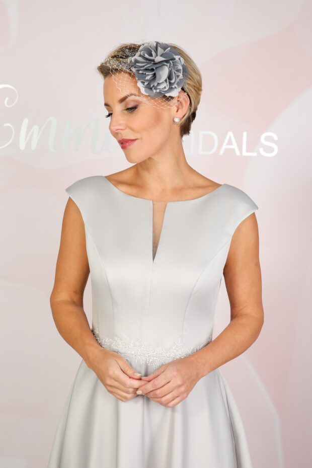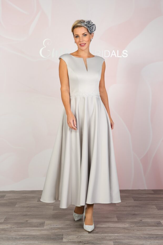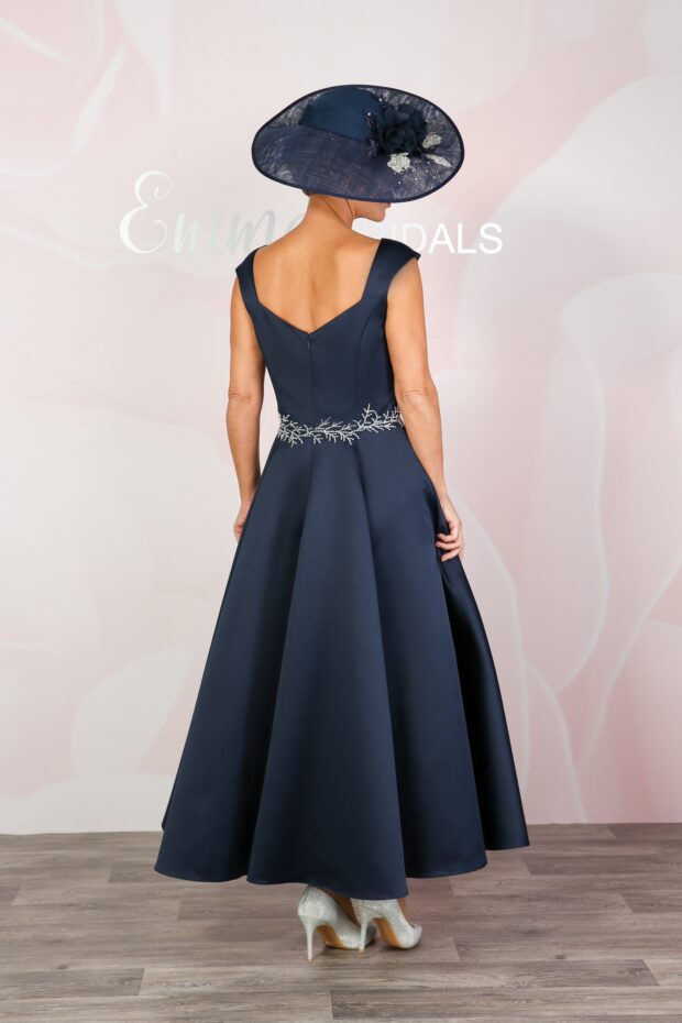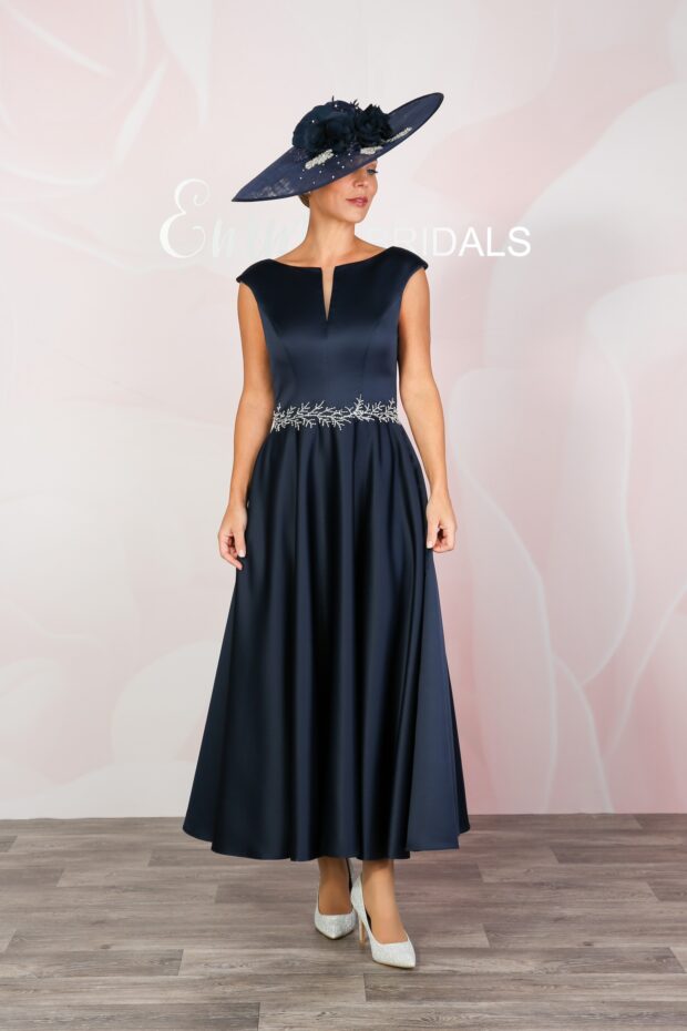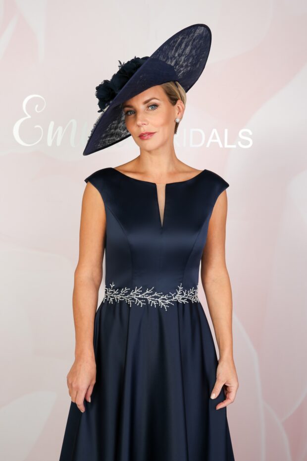 features a sparkling beaded lace waistband. Princess seams on the bodice ensure a superb fit around the bust and a boat neck with a sharp V on the front adds to the elegance of this look. A tulle panel ensures everything feels secure and the cap sleeves, combined with a high neckline and an open back, create a sophisticated style. Secures at the back with an invisible zip and is shown here in Platinum and Navy.