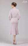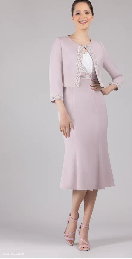 * Pleated contrast bodice * Wide pleated waist belt * Fluted pencil skirt * Pearl bead detailing * Matching jacket