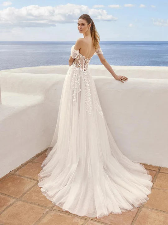 Leaving us in a trance, CLAIRE is perfect for our dreamy romantics. This ethereal A-line beauty showcases a plunging sweetheart neckline with intricate 3D floral motifs and embroidered lace atop sparkly glitter tulle fabric. The romantic exposed corset boning, illusion side cut-outs, and off-the-shoulder tulle straps tie together to create an enchanting bridal look. The lovely lace is carefully placed along the corset-style back and peek-a-boo slit, trickling down into a soft and sparkly tulle skirt.