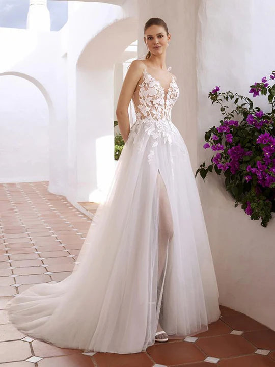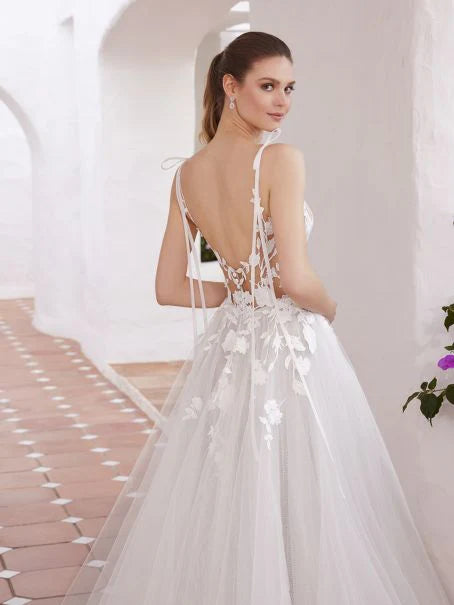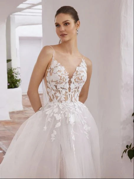 Make all your ethereal bridal dreams come true with CLOVER. This magical A-line gown features exquisite botanical lace along the V-neckline and illusion corset bodice that trickles down into the airy tulle skirt. The ultra-thin spaghetti straps include dainty bow strap details that add a dreamy touch. The tasteful peek-a-boo slit and V-shape illusion lace back complete this stunning beauty.