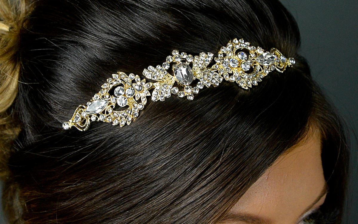 Delicate headband style tiara in gold, large and small crystal diamantes, measuring just over 1″ at the widest point.